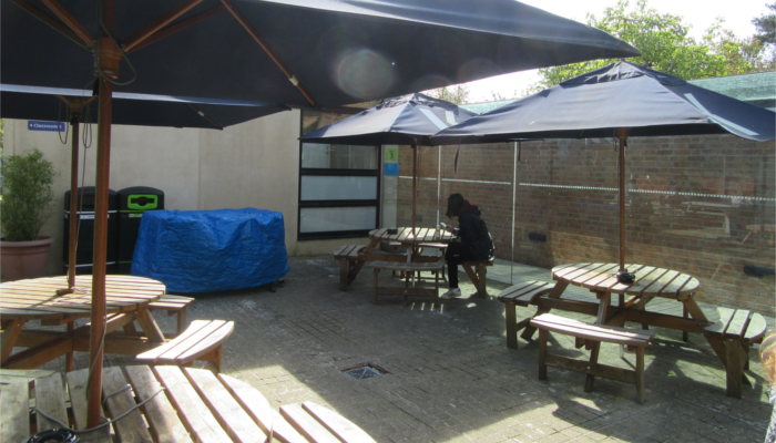 でも、何と言っても、屋外で英語でおしゃべりしながら食事を嗜んで生徒同士の交流を育むのが一番楽しいですね。そのためのテーブルや日よけのパラソルもしっかり整備されています。